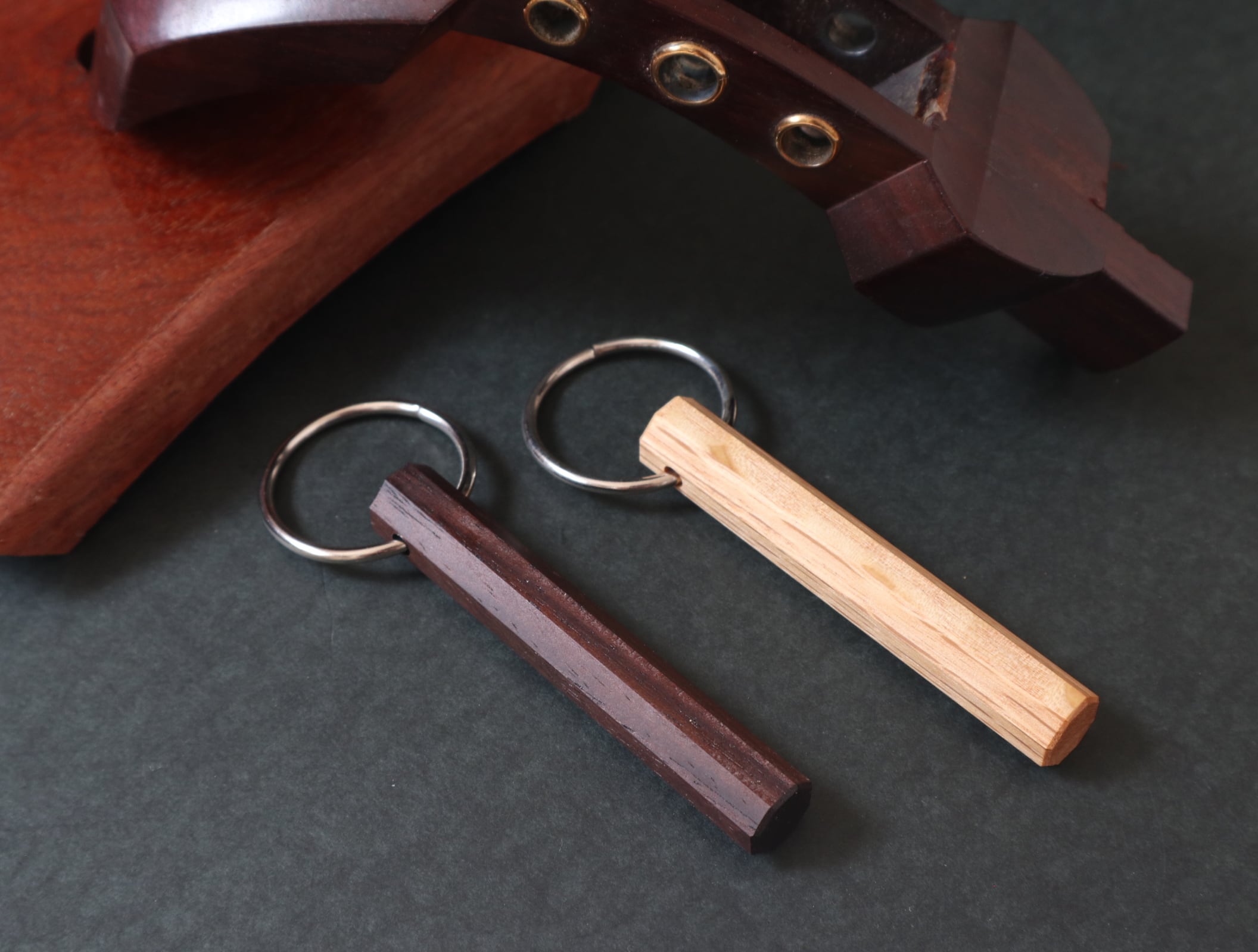 シンプルなフォルムに木の質感が映える、木製のキーリング。